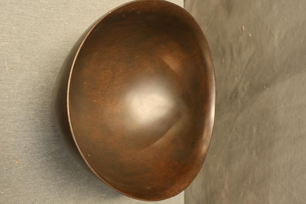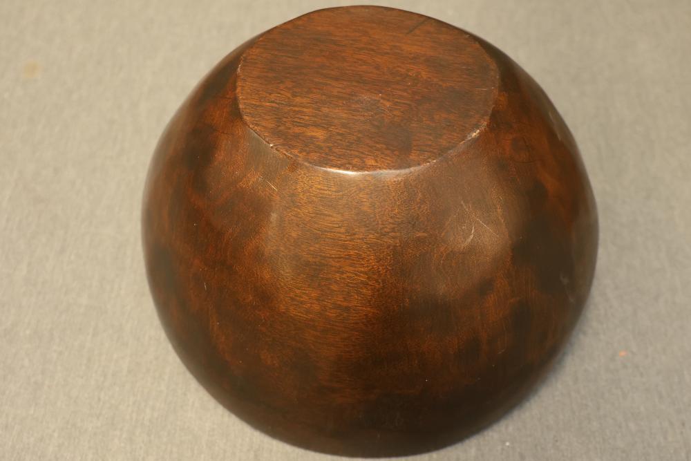 Dark Brown Wooden Oval Bowl and Rounded Hand Carved Wooden Bowl. The rounded bowl is marked on the bottom "Blair A, Honolulu, Monkey pod wood." Both bowls display smooth finishes and natural grain patterns. Pickup only.