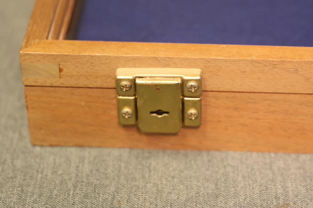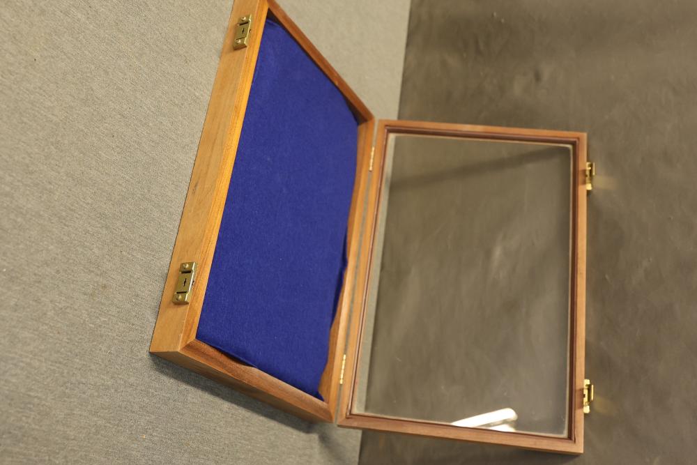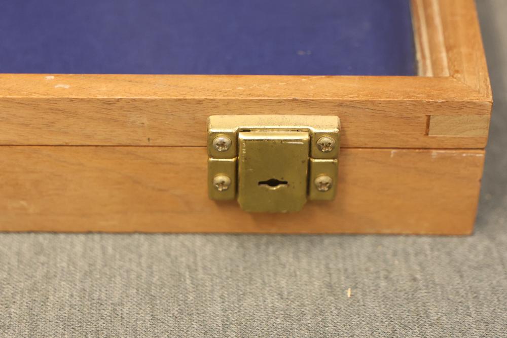 Wooden showcase with glass frame and bronze locks. Includes a layer of blue felt on the inside for secure storage of items. Measures approximately 18 inches long, 12 inches wide, and 2.5 inches deep. Pickup only.