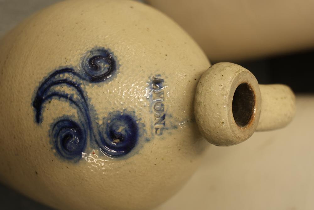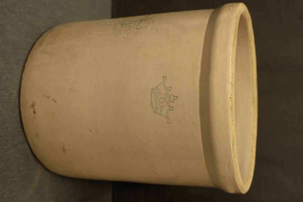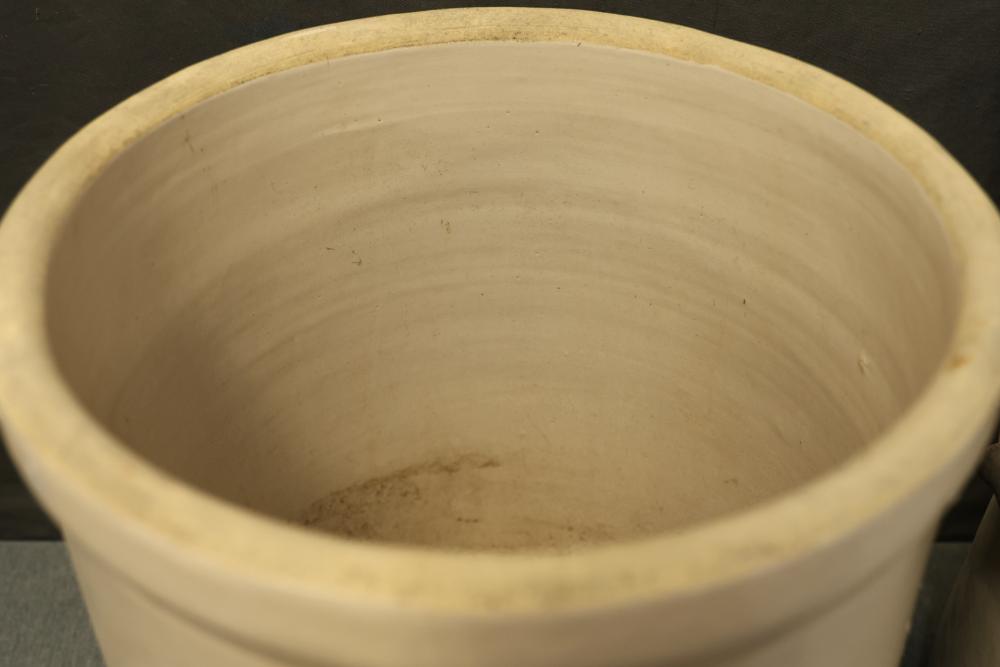 8-Gallon Stoneware Crock, 6-Gallon Stoneware Crock, and Stoneware Jug. The 8-gallon crock measures approximately 15.5 inches high with a 13.5 inch diameter. The 6-gallon crock measures approximately 14.5 inches high with a 13 inch diameter. The stoneware jug measures approximately 11 inches high. Pickup only.