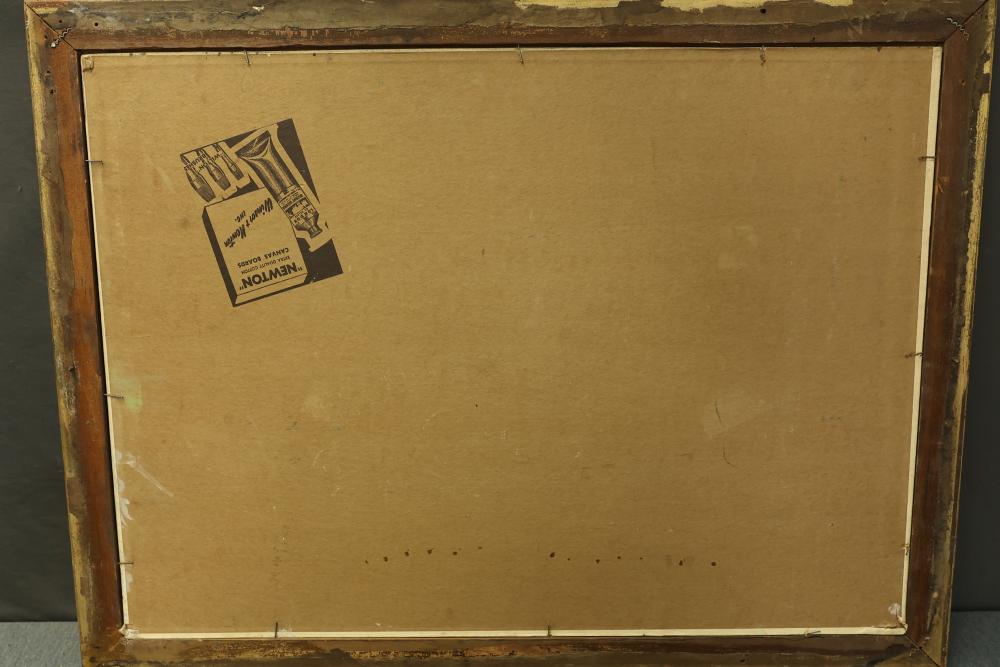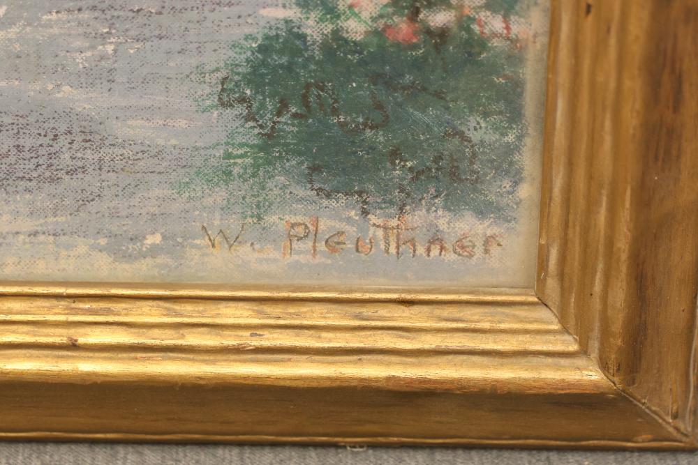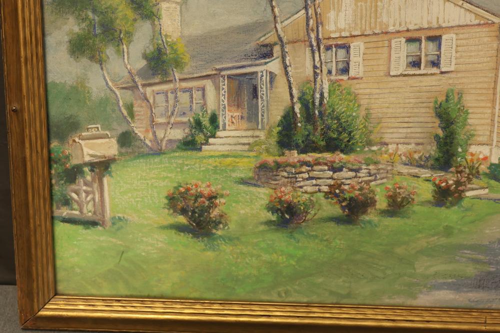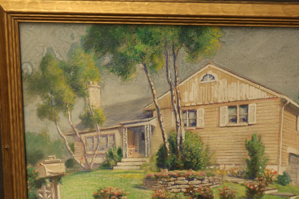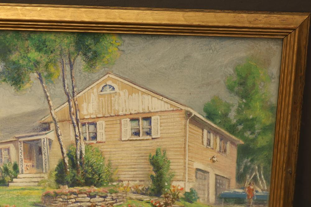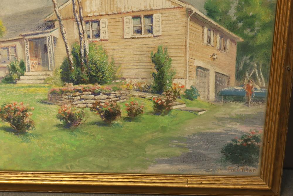 Framed acrylic on canvas depicting the outside of a suburban home, untitled, signed "W. Pleuthner" in the bottom right of the artwork. Measures approximately 33.5 inches long by 25.5 inches wide. Pickup only.