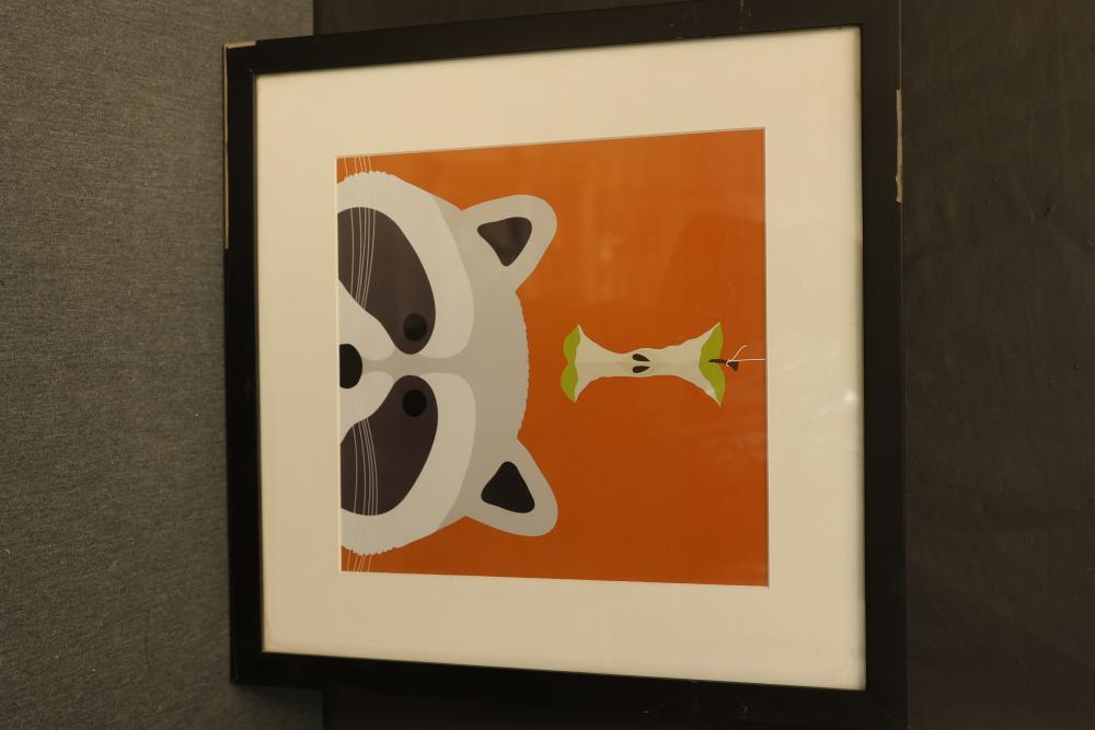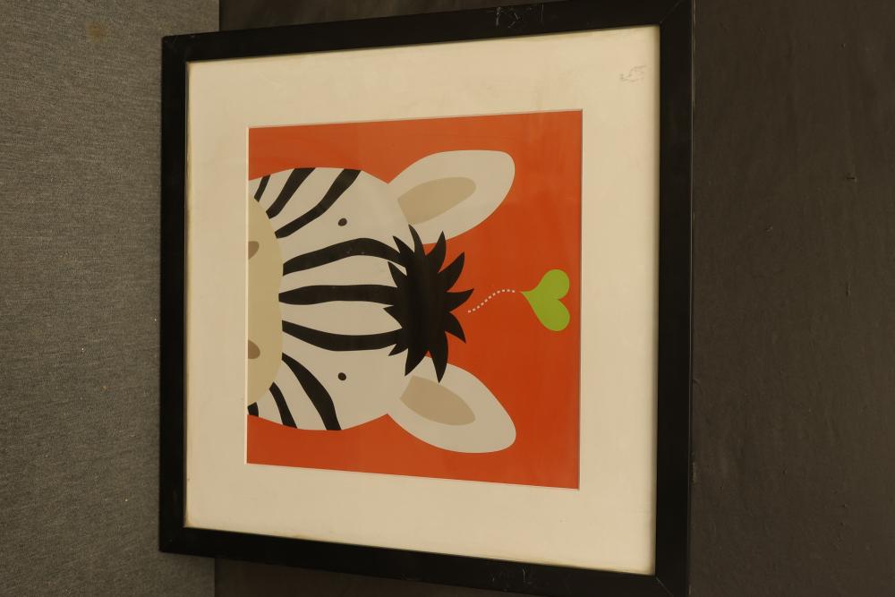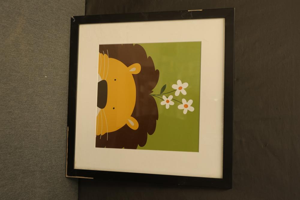 Framed prints in the style of Yuko Lau's "Peek-a-Boo" series, featuring zebra, hippo, lion, and raccoon designs. Each piece is framed, with dimensions of approximately 18.5 inches long by 18.5 inches wide. The frames show minimal wear. Pickup only.