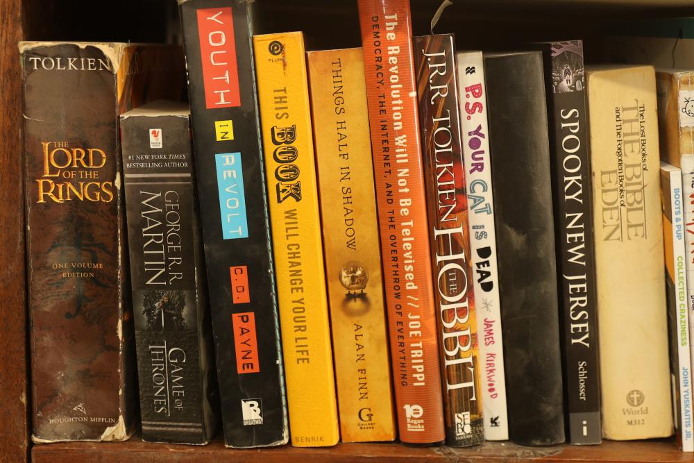Books and Graphic Novels by Tolkien, Martin, Larson, Wright, and Devereaux, featuring titles such as The Lord of the Rings, A Game of Thrones, and works from various genres. Includes older hardcover editions and modern paperbacks. Pickup only.