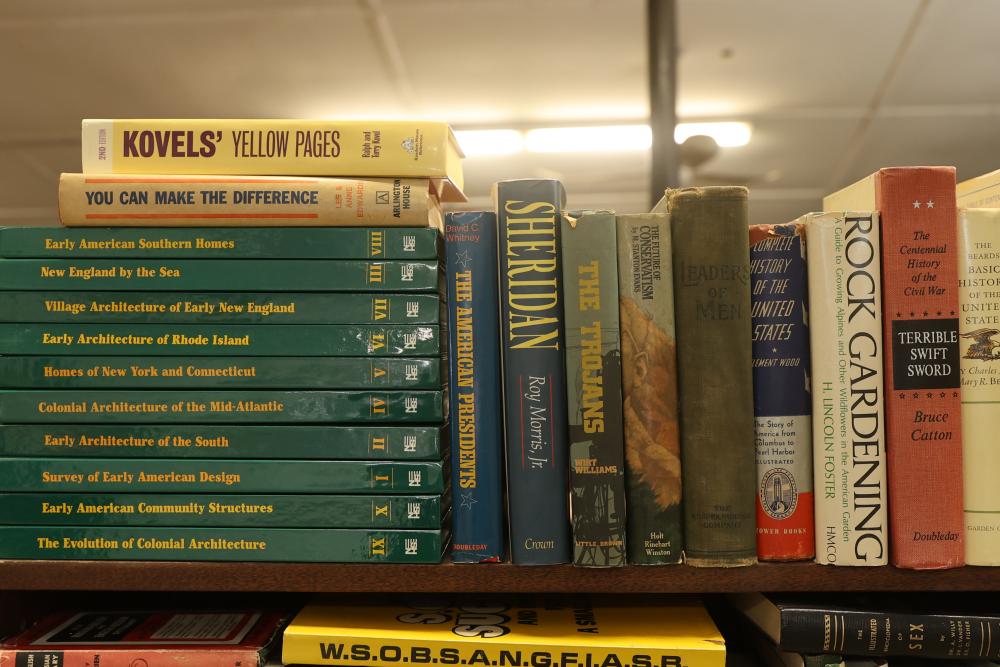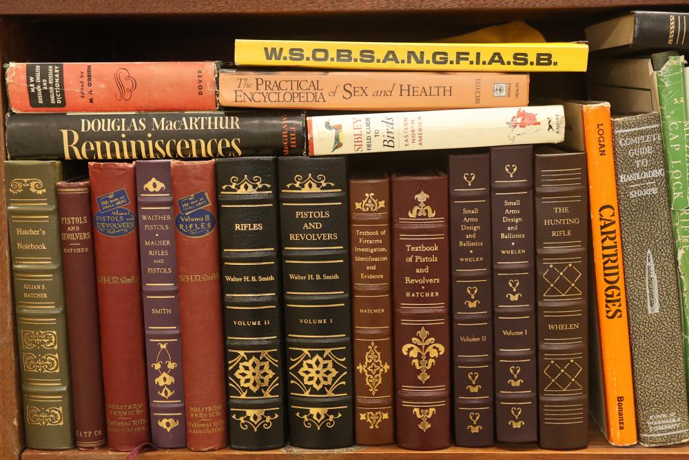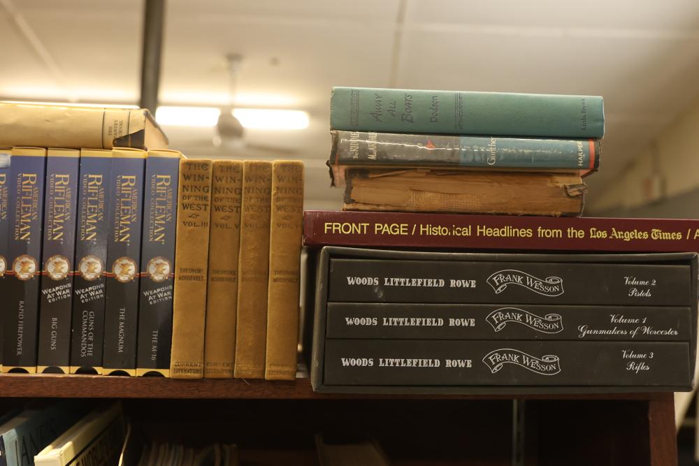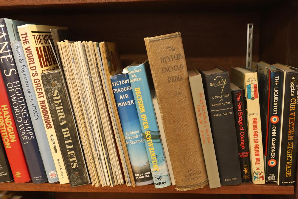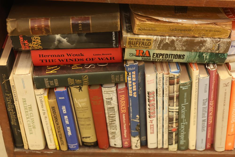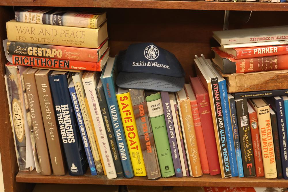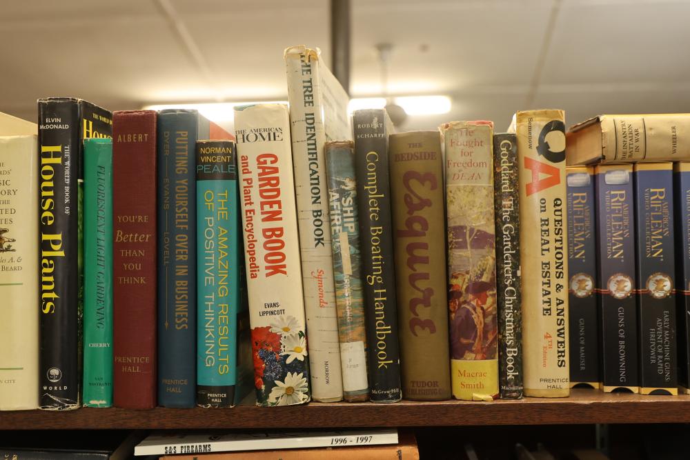 Book Collection on Gardening, Automobiles, Firearms, and Architecture with DVDs/VHS. Includes books by authors such as Leo Tolstoy, Stephen Crane, and Charles Edward Chapel. Covers topics including lawn and garden care, automotive history, firearms, and architectural design. Some VHS and DVDs are present. Bookshelf is not included. Pickup only.