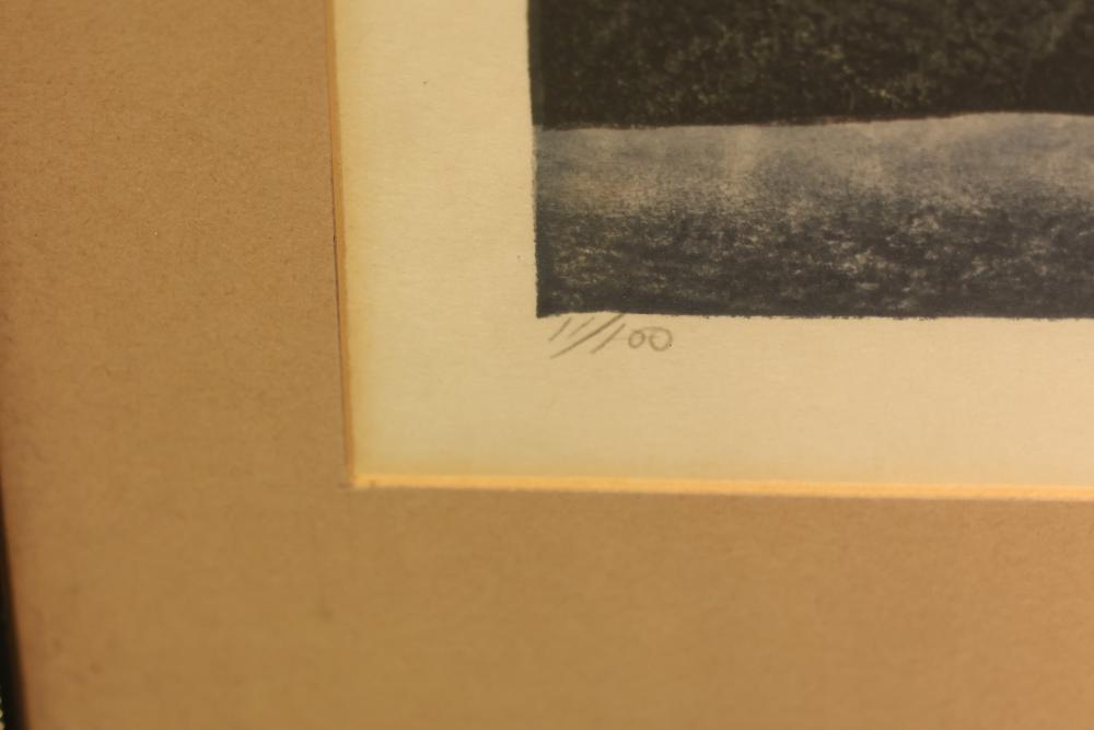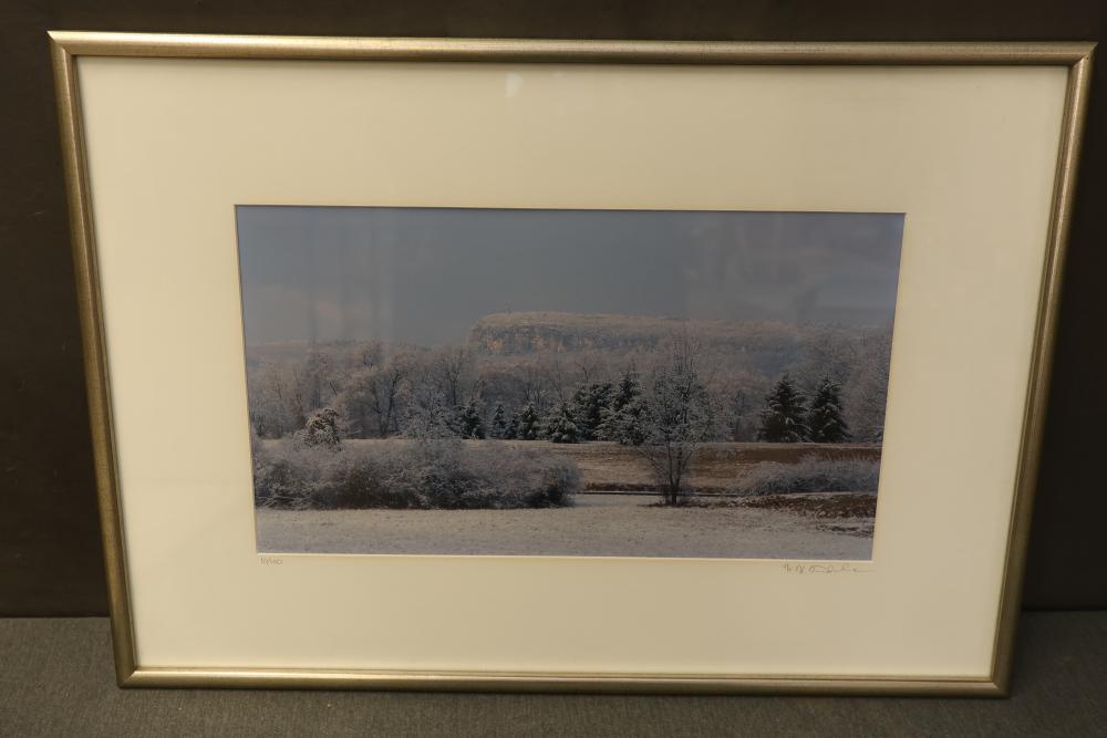 Framed Watercolor and Photograph with Signed Limited Editions. Includes a framed watercolor titled "Evening's Shadow," pencil-signed on the lower right, in a limited run of 11/100, measuring approximately 28.5 inches long and 22.5 inches wide. Also includes a framed landscape photograph of Minnewaska Mountain, pencil-signed on the lower right, in a limited run of 10/100, measuring approximately 27 inches long by 19 inches wide. Pickup only.