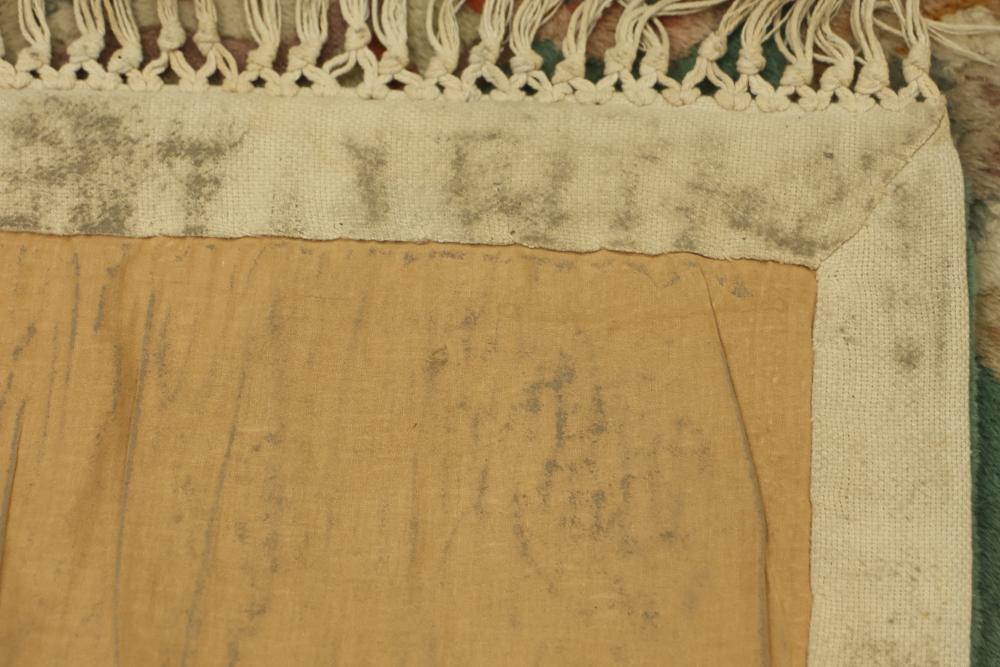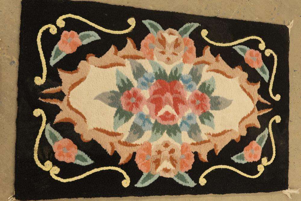Machine-made rugs, quantity of 4, with varying sizes ranging approximately from 40 inches long by 22.5 inches wide to 29 inches long by 17 inches wide. The designs include floral and geometric patterns in multiple colors. Condition shows signs of wear and discoloration on the backing. Pickup only.
