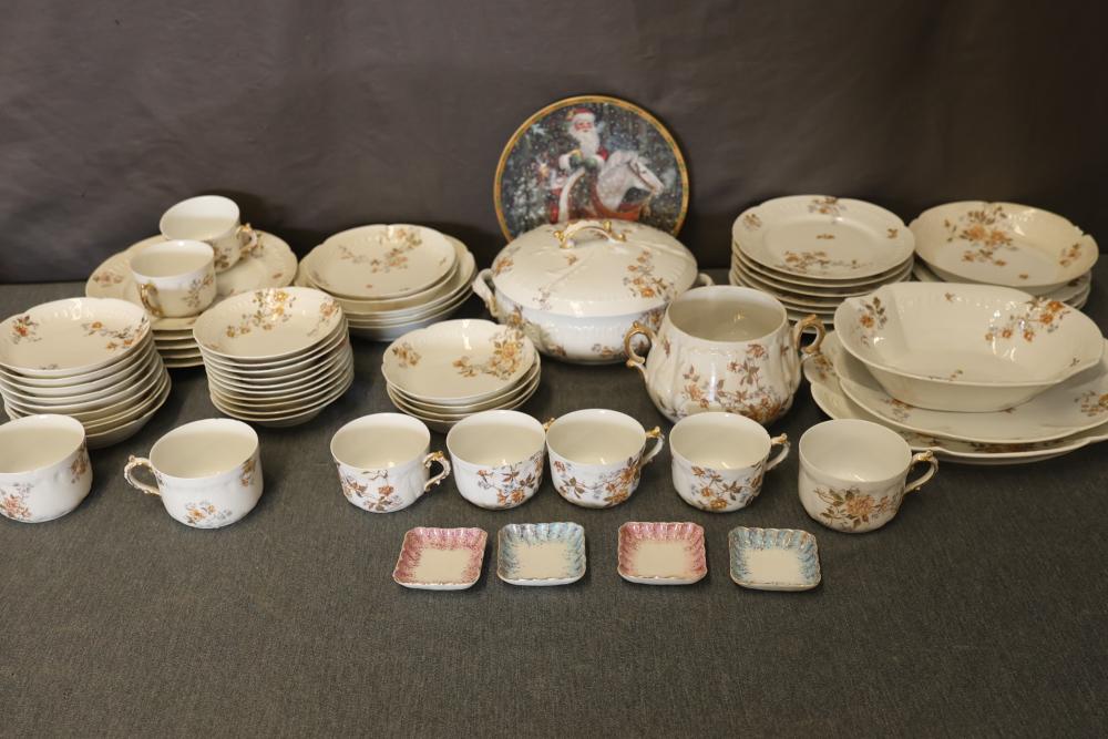 Dishware including Limoges plateware consisting of dinner plates, saucers, and tea cups and one Lenox 'Santa of the Northern Forest' decorative plate. Limoges pieces feature floral patterns and gold accents. Includes plates, handles on cups, and serving pieces. Pickup only.