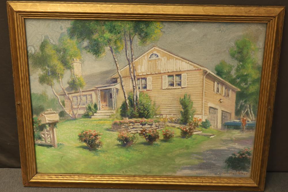 Framed acrylic on canvas depicting the outside of a suburban home, untitled, signed "W. Pleuthner" in the bottom right of the artwork. Measures approximately 33.5 inches long by 25.5 inches wide. Pickup only.