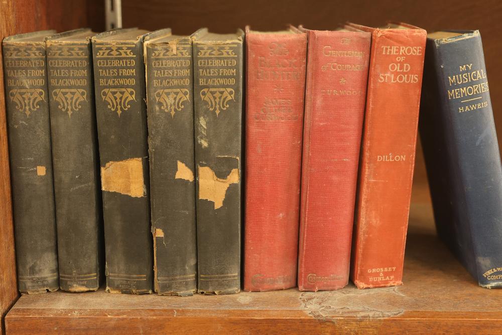 Vintage books including five volumes of 'Celebrated Tales from Blackwood,' 'The Black Hunter' by James Oliver Curwood, 'The Gentleman of Courage' by James Oliver Curwood, 'The Rose of Old St. Louis' by Mary Dillon, and 'My Musical Memories' by H. R. Haweis. Books are aged and display signs of wear and tear. Pickup only.