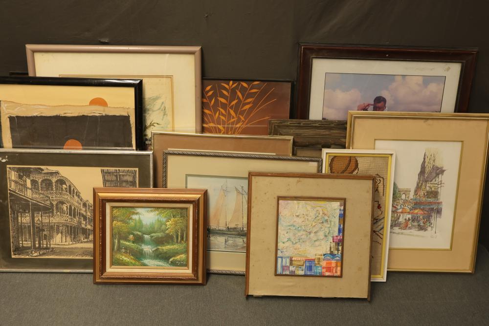 12 artwork pieces by different artists in varied mediums, including a framed print of "Acrobat" by Man Ray, watercolors such as "Frances P. Mesquita 1905" by Allen Hawkes and "Thistles" by Jane McConnaughey Boling, and "Double Waterfall," an oil on board signed as Lipman. Pieces range in size from approximately 36.25 inches long x 24.25 inches wide to approximately 14.5 inches long x 12.5 inches wide. Pickup only.