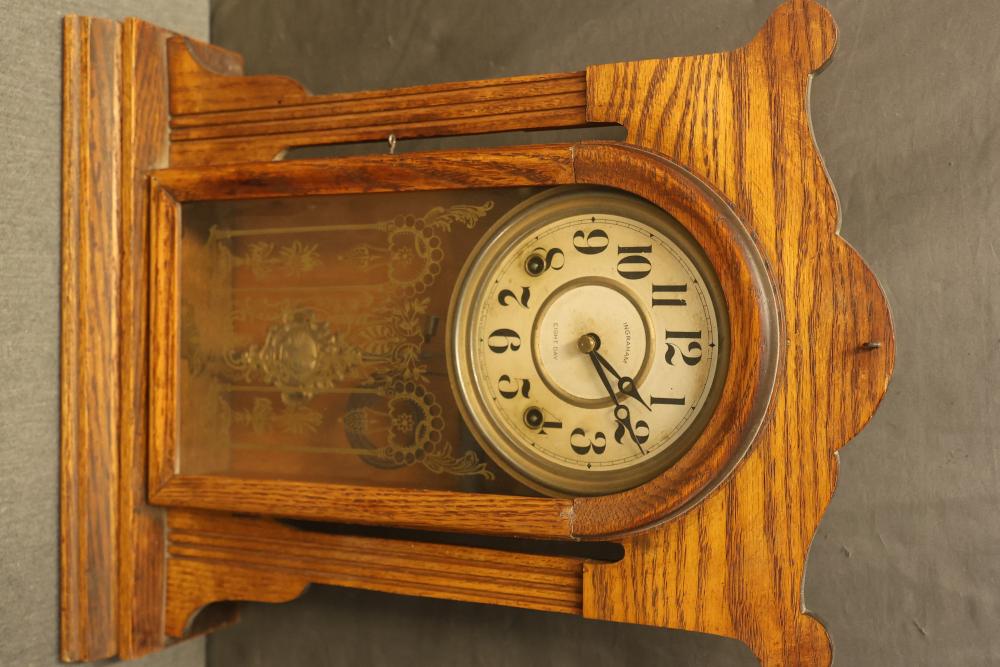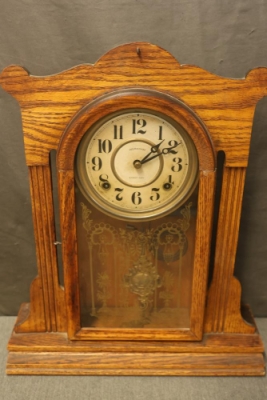 E. Ingraham & Co. Gingerbread Mantle Clock. Cabinet frame shows wear in some areas and is loose. Features an ornate wooden design with a glass front panel, clock face with bold numerals, and an internal pendulum. Pickup only.
