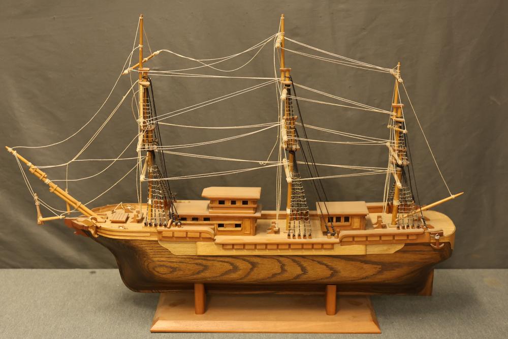 Decorative wooden model of a sailing ship with base. Measures approximately 20 inches high, 34 inches wide, 7 inches deep. Height changes to approximately 23.5 inches high when sitting on the base. Pickup only.