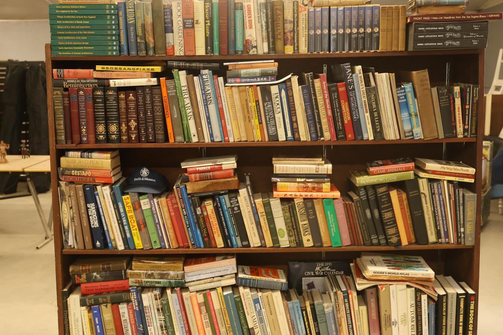 Book Collection on Gardening, Automobiles, Firearms, and Architecture with DVDs/VHS. Includes books by authors such as Leo Tolstoy, Stephen Crane, and Charles Edward Chapel. Covers topics including lawn and garden care, automotive history, firearms, and architectural design. Some VHS and DVDs are present. Bookshelf is not included. Pickup only.