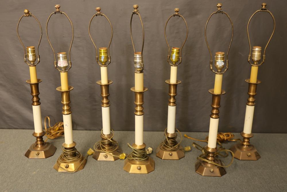 Mohonk Mountain House Brass Single Candlestick Table Lamps, Quantity of 6. Set of six brass table lamps designed in a single candlestick style. Featuring brass components with white accents and each equipped with wiring and sockets. Some lamps show wear consistent with prior use. Pickup only.