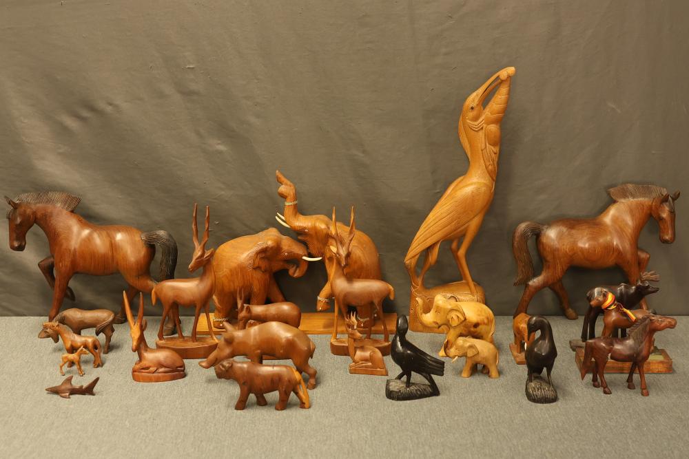 23 Wood-Carved Animal Figurines made from polished wood, depicting diverse animals including elephants, horses, antelopes, and birds. Intricately detailed, with variations in size and style. Pickup only.