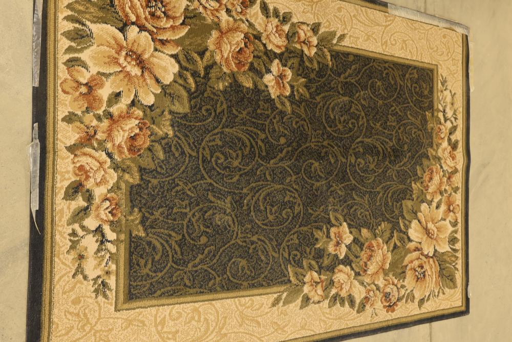 Machine-made rug featuring a floral pattern, approximately 85 inches long by 60 inches wide. The rug showcases a detailed design with intricate floral accents framed by ornamental borders. Pickup only.