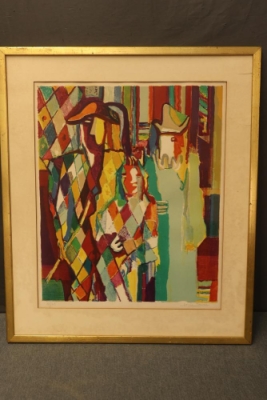 Framed lithograph of "Figuren" by Louis Favre, signed by the artist on the bottom right and marked as number 21/45 in a limited edition run. The artwork measures approximately 27 inches long and 23 inches wide. Pickup only.