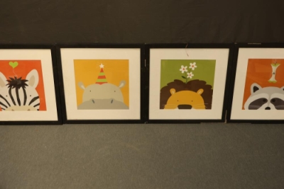 Framed prints in the style of Yuko Lau's "Peek-a-Boo" series, featuring zebra, hippo, lion, and raccoon designs. Each piece is framed, with dimensions of approximately 18.5 inches long by 18.5 inches wide. The frames show minimal wear. Pickup only.