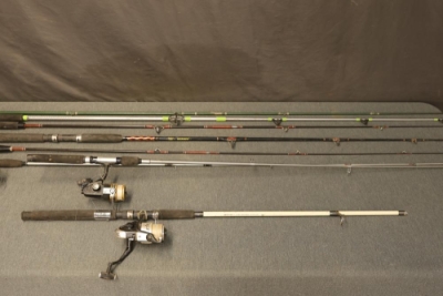 7 fishing rods including the Stinger by Zebco, the Mariner by Penn Fishing, and the Tiger by Shakespeare Fishing. Three rods are equipped with fishing reels. Pickup only.