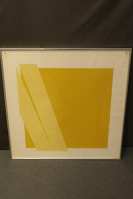 Abstract Yellow Box With Stripes, Untitled, Framed Lithograph, 4/50. This piece is part of a limited run, numbered '4/50' in the bottom left corner. Signed 'Condeso 76' in the bottom right corner. Measures approximately 30.25 inches long by 30.25 inches wide. Pickup only.