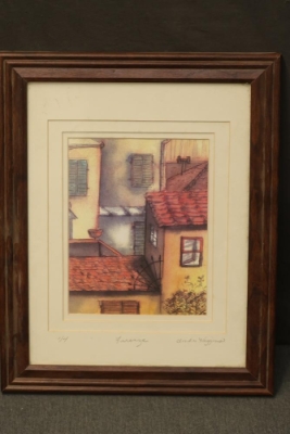Limited edition print titled "Ferinze" by Drnia Higgins. Numbered in the lower left corner as "1/4" and signed in the lower right corner. The piece measures approximately 15 inches long by 12 inches wide and is presented in a wooden frame with a wire backing. Pickup only.
