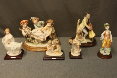 Six porcelain statues including four by Giorgio Armani, one by Arnart, and one by KPM. Each statue features finely detailed designs. Includes depictions of children and musical themes. Statues are mounted on wooden bases, and nameplates are attached. Pickup only.