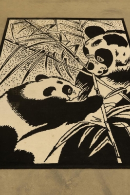 Black and White Panda-Themed Area Rug, Machine Made. Measures approximately 88 inches long and 66 inches wide. Features a detailed panda design. Note some staining on the bottom third of the rug, see photos for details. Pickup only.