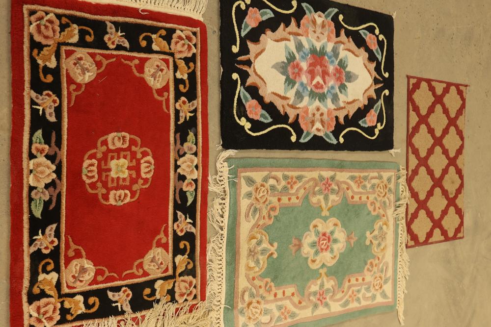 Machine-made rugs, quantity of 4, with varying sizes ranging approximately from 40 inches long by 22.5 inches wide to 29 inches long by 17 inches wide. The designs include floral and geometric patterns in multiple colors. Condition shows signs of wear and discoloration on the backing. Pickup only.
