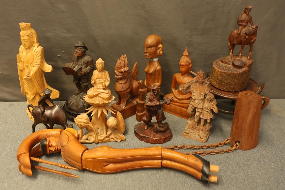 12 Wood-Carved Figurines, showcasing various depictions including musicians, animals, and cultural figures, crafted from wood in diverse designs and sizes. Includes figurines with fine details and some labeled 'Uruguay'. Pickup only.