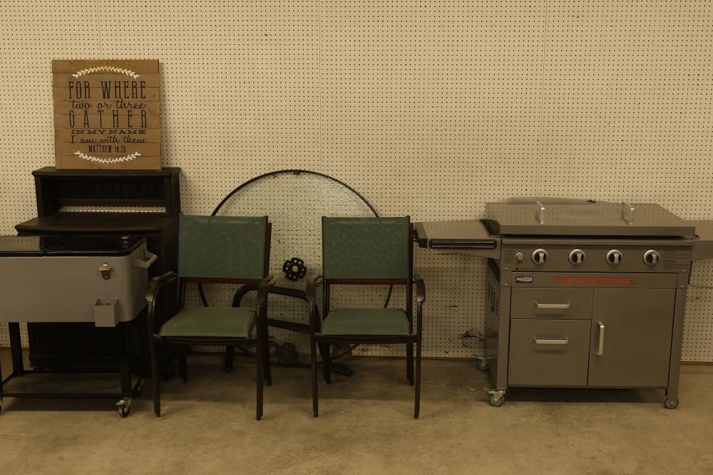 Patio Furniture with Blackstone Model 1818 ProSeries Outdoor 4-Burner Gas Griddle with cover (measures approximately 39.25 inches high, 67 inches wide, 23.5 inches deep). Includes a glass patio table (approximate 44-inch diameter, unassembled), 80-quart rolling cooler cart (measures approximately 33.5 inches high, 36 inches wide, 15.5 inches deep), Suncast rolling patio storage/prep station (measures approximately 44.5 inches high, 30 inches wide, 19 inches deep), 4 patio chairs (19.5-inch wide seats, two red and two green), and a rustic wooden wall sign featuring Matthew 18:20 (measures approximately 24 inches by 24 inches). Pickup only.