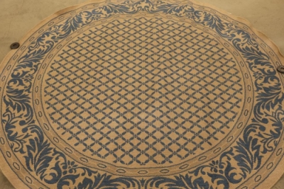 Machine-Made Savafieh Courtyard Blue Round Indoor/Outdoor Area Rug. Diameter of approximately 100 inches. Features an intricate blue pattern on a neutral-toned background, suitable for both indoor and outdoor use. Pickup only.