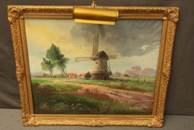 Framed oil painting on canvas measuring approximately 27 inches long and 23.5 inches wide depicting a windmill scene. Features a gilt frame with an attached functional light fixture and is signed "Vanher" on the lower right-hand side. Pickup only.