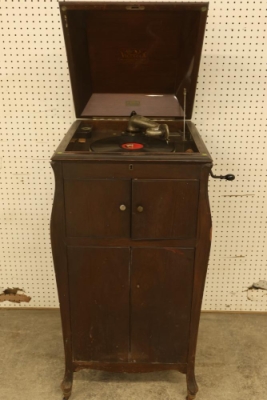 Victor Victrola VV-XI Hand-Cranked Record Player. Features wooden front cabinet with shelves and brass pulls. Measures approximately 43.5 inches high, 21 inches wide, and 21.5 inches deep. One back wheel is damaged, and one brass pull is missing. Pickup only.