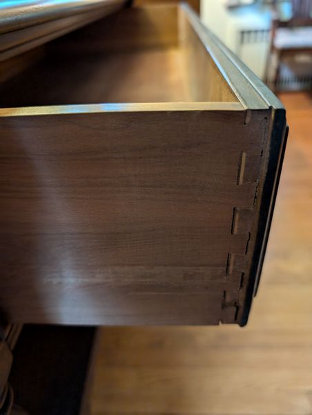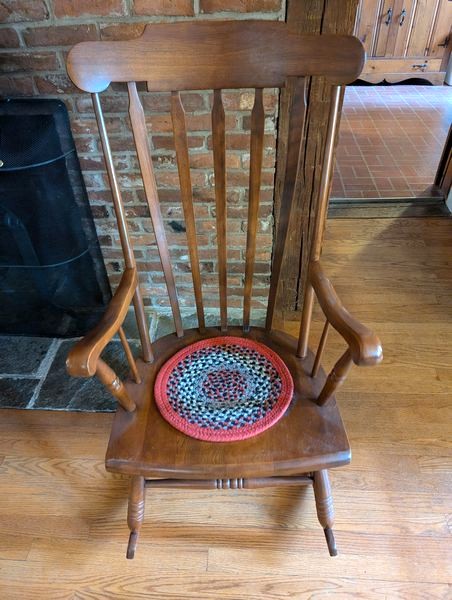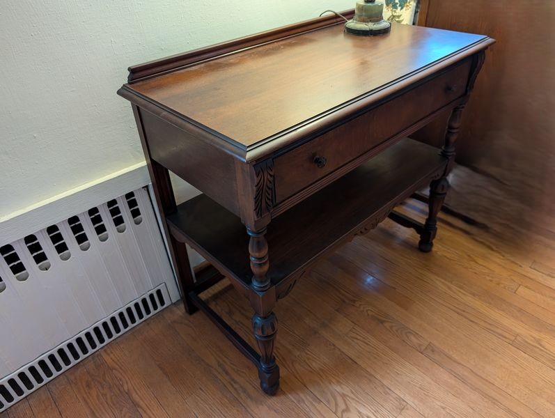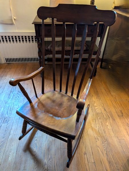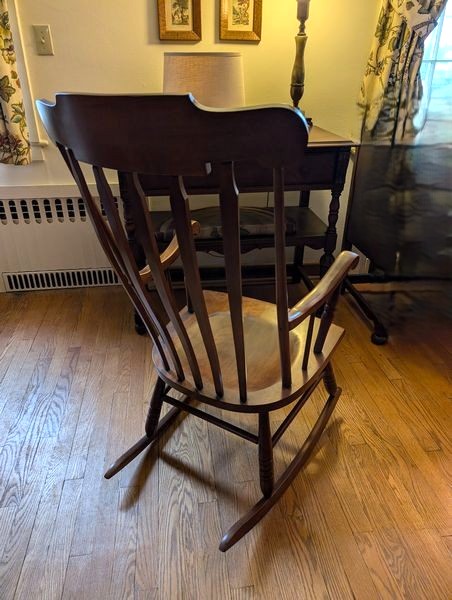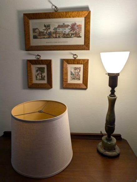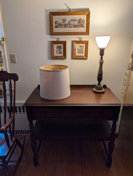 Antique Buffet, Rocker, Lamp, Art. Antique small buffet, 38"Wx19.5"Dx33"H with single dovetailed drawer; Tell City rocking chair, 22.5"Wx2'Dx42"H; table lamp, 2'H; three pcs framed wall art.