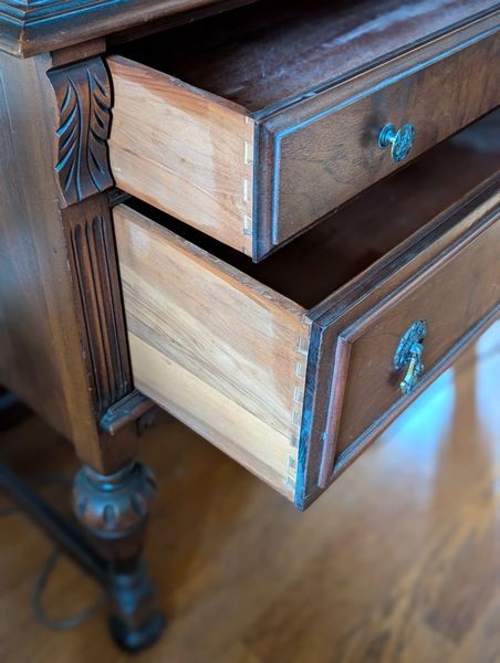 Antique Highboy Hutch. Hardwood a antique hutch, 35.5"Wx17"Dx5'H with two dovetailed drawers, incl lg linen drawer 7.5"deep & plate grooved int shelf. Matches items in lot #3 & #4.