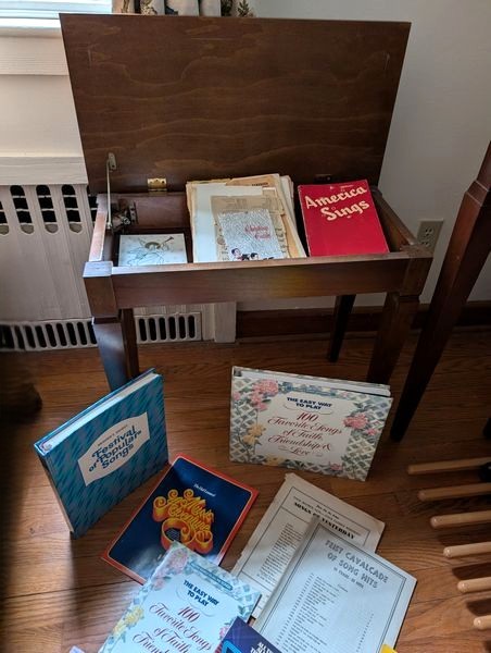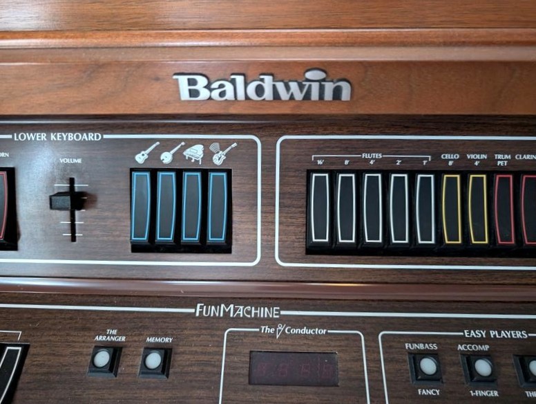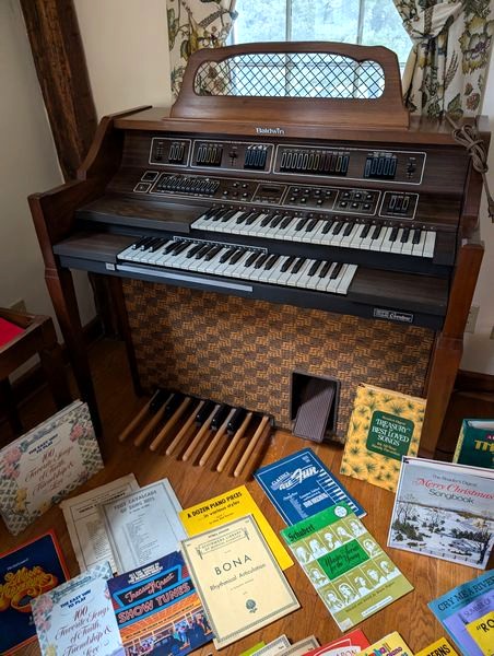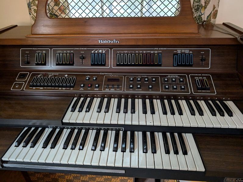 Baldwin Electric Organ and Bench. Baldwin electric organ, 44"Wx2'Dx41"H; storage bench; assort music. See photos for details. Loc near front door on main floor.