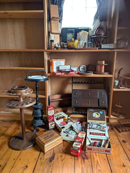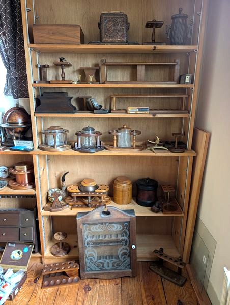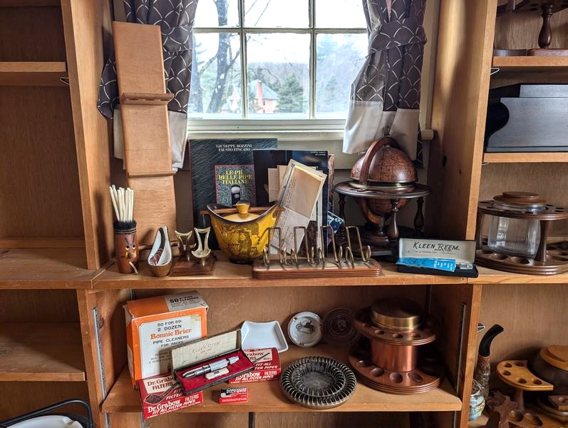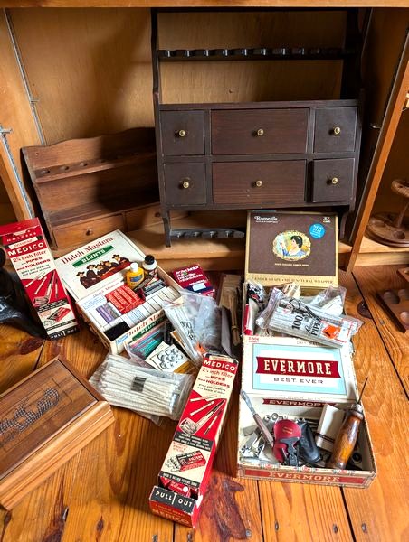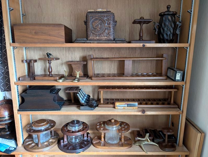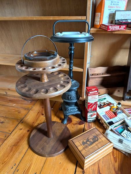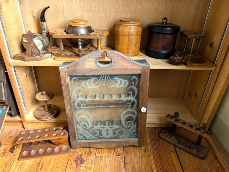 Pipe Holders and Cleaners. Very lg lot of vintage & antique pipe holders (wood & copper); glass display cab, 16"Wx4"Dx22"H; wood pipe display/snuff box, 18"Wx5"Dx19"H; two ashtray stands, 27"H & 29"H; cleaners; related items as seen in photos.