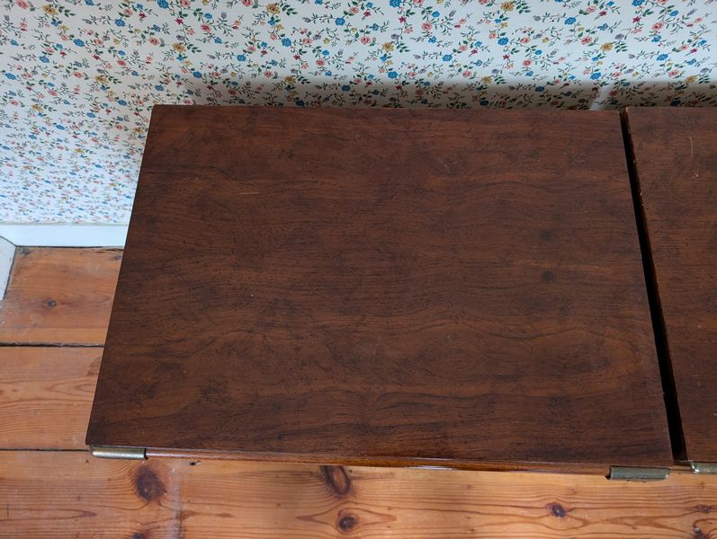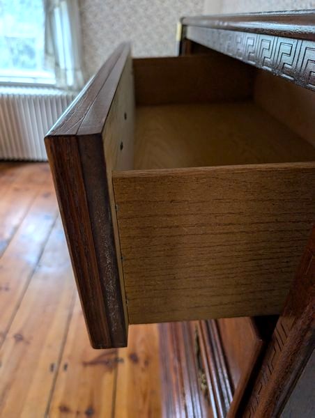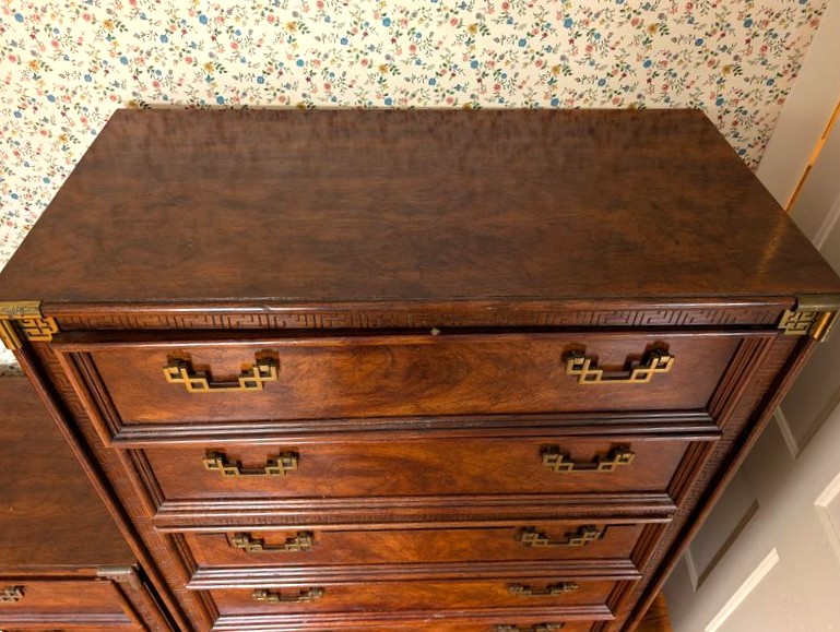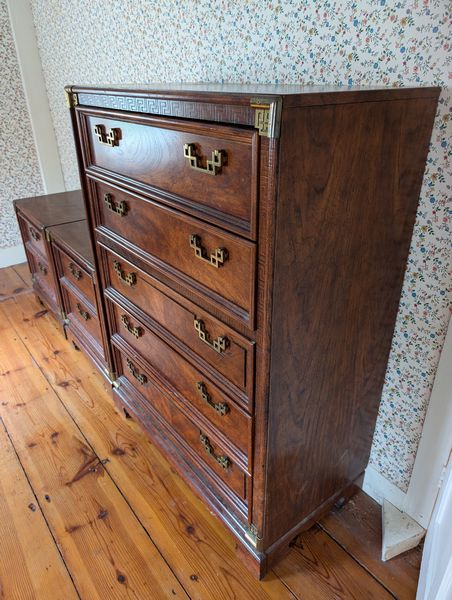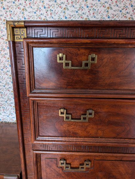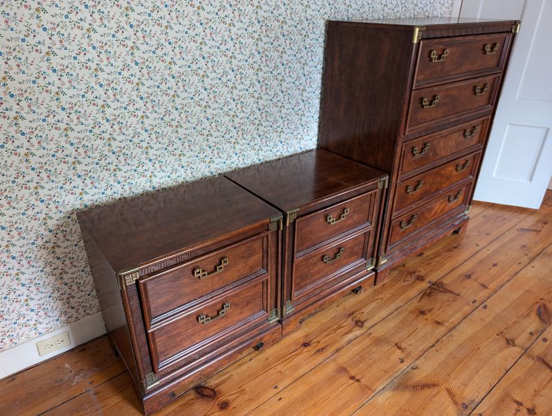 Set Three Vintage Bedroom Furniture. Asian-style 5-drw chest, 3'Wx17.5"Dx4'H; matching pr nightstands, ea. 23.5"Wx17"Dx24.5"H (with brass HW & corner trim). Loc on 2nd fl.