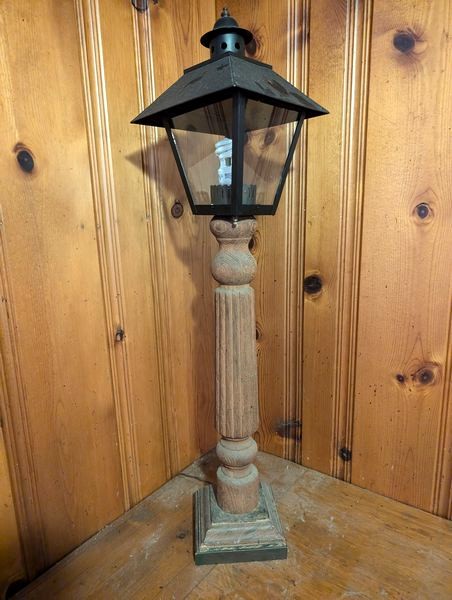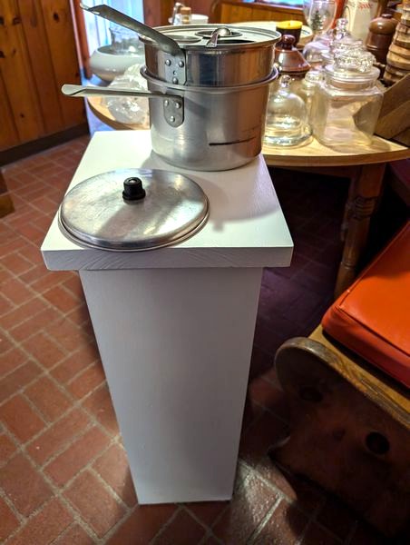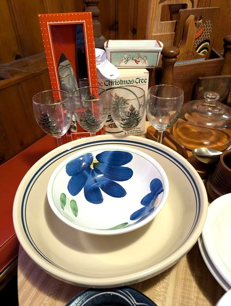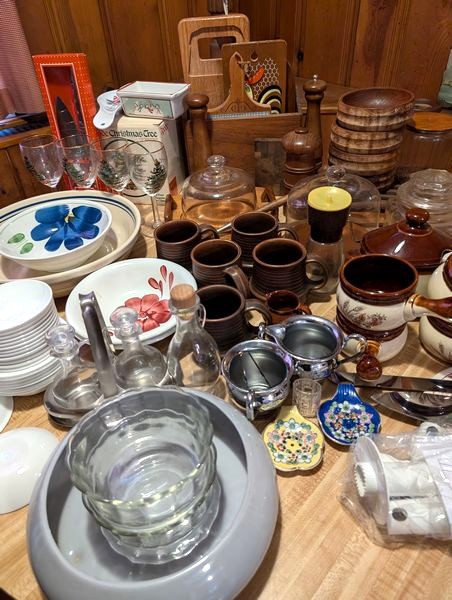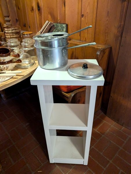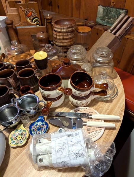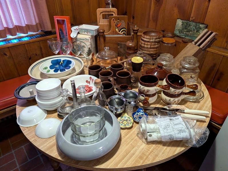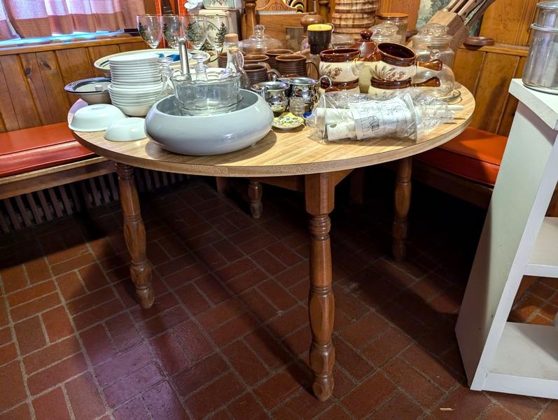 Kitchen Table, Wood Lantern, Bakeware, Entertaining. Kitchen table, 42"diam x29"H; electric wood lantern, 39"H; white cabinet; assort functional kitchen items, incl bakeware, cookware, entertaining. See photos for more details.