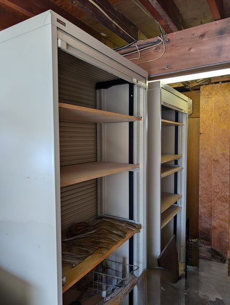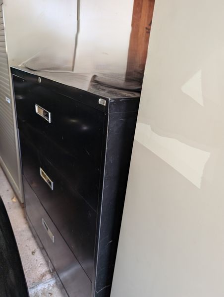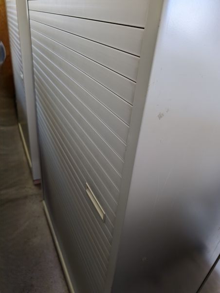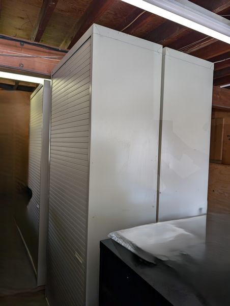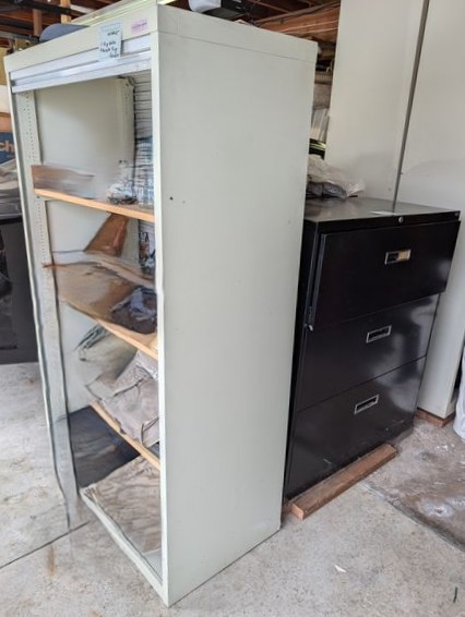 Metal Commercial Cabinets. Four tall tan metal file cabinets, ea. 3'Wx16"Dx84"H with tambour closures; one tan short open file cab, 3'x16"x5'H; two black short metal 3-drw lateral file cabinets. See photos. Items seen on/around cab's not incl. Loc in garage.