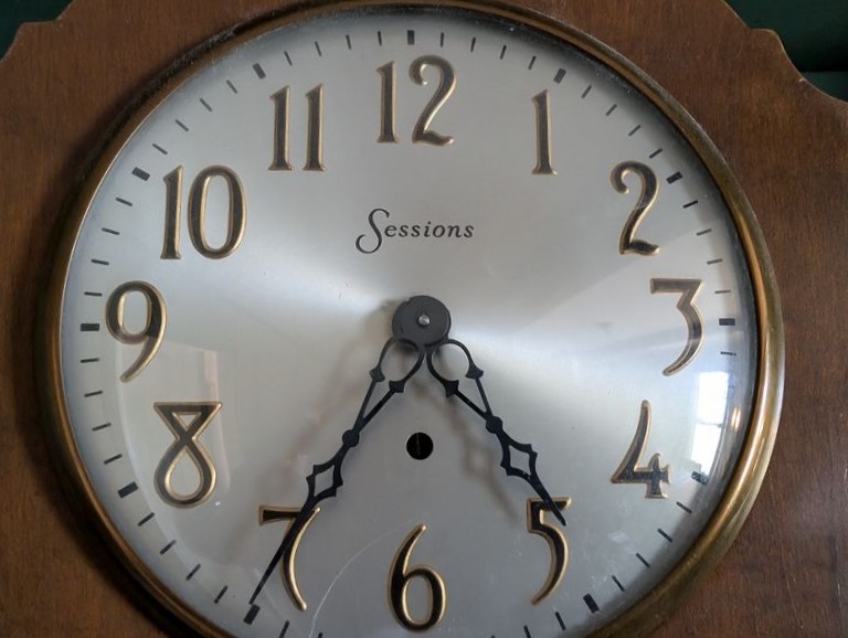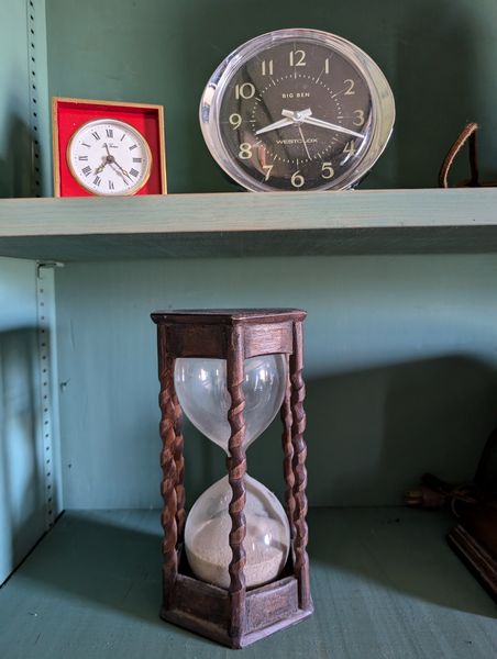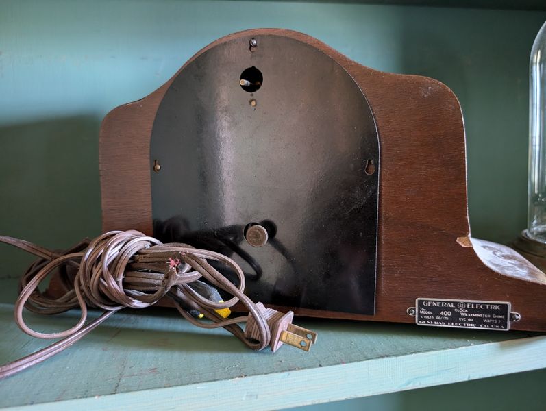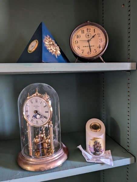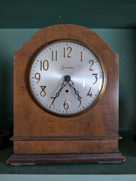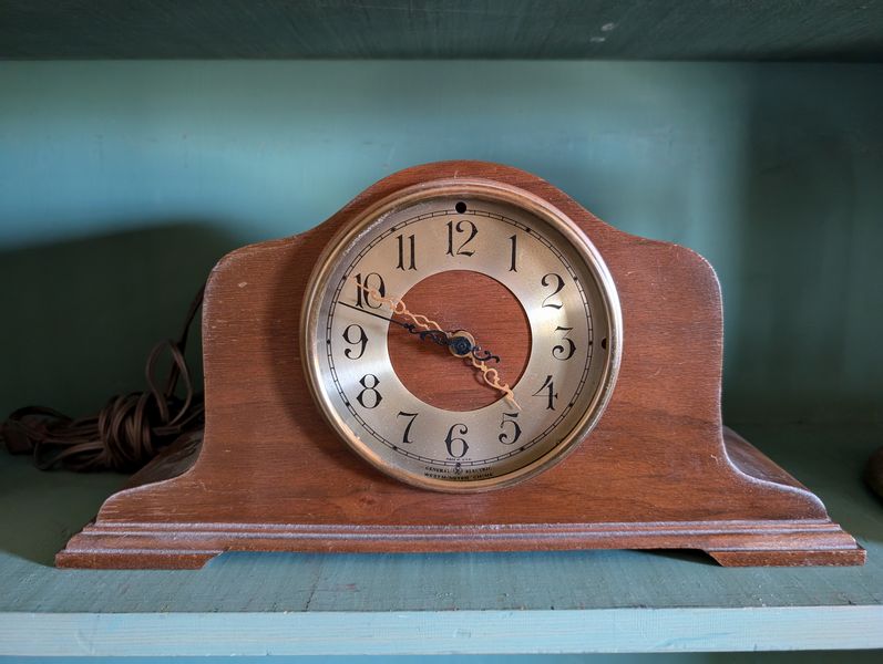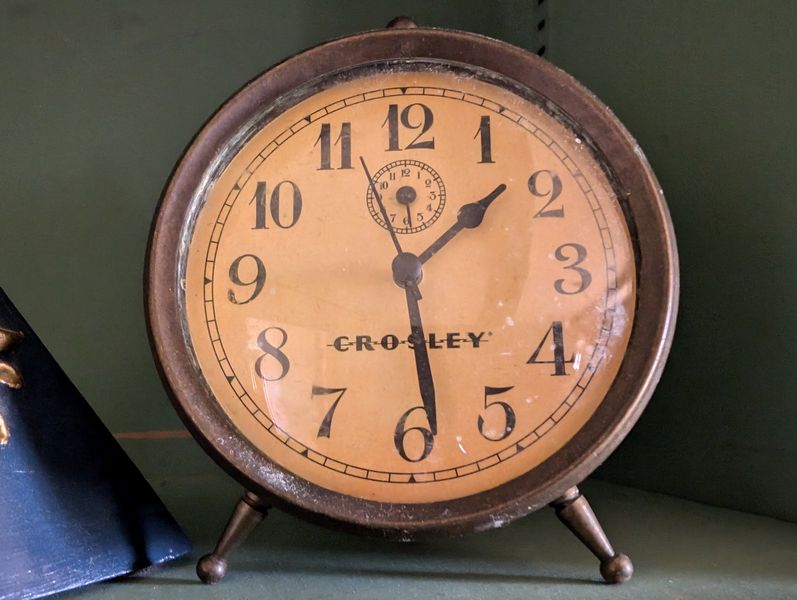 Clocks and Timer. Eight vintage & antique clocks (see photos for makers, incl: Sessions, 10"; G.E. with Westminster chime, 13"; Crosley; Seth Thomas, 9"; others & condition); one antique time keeper.