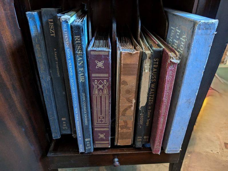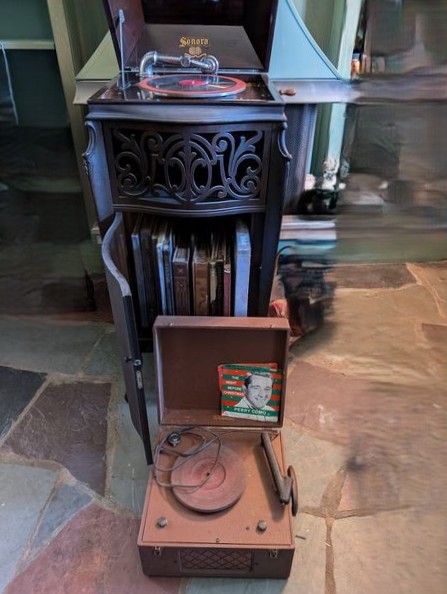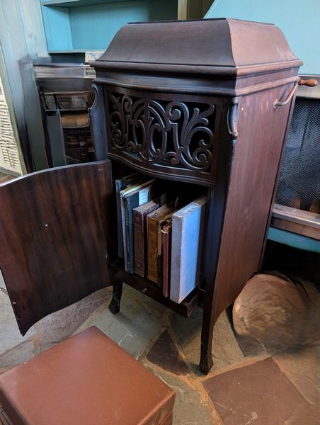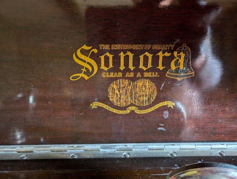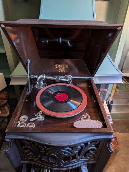 Sonora Antique Radio Cabinet. Antique Sonora phonograph, 19"sq x44"H; Symphony port turntable; records. See photos for details & cond.