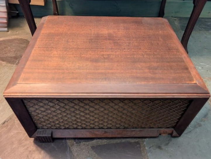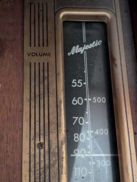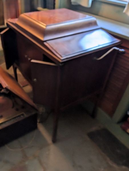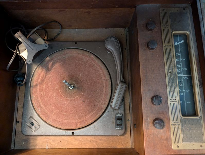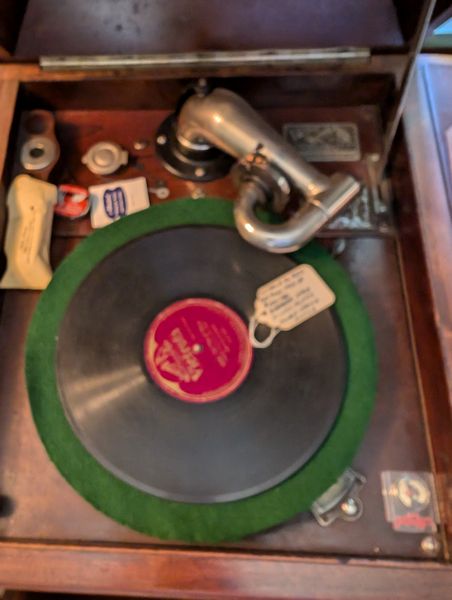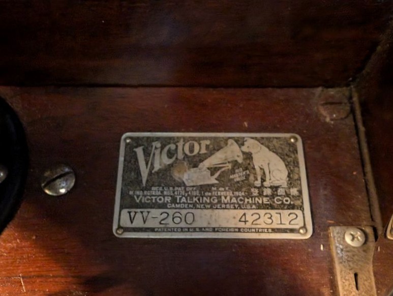 Victor Victrola, Turntable. Victor Talking Machine Company humpback, nickel plated victrola, #260, 33"Wx19"Dx32"H; Majestic turntable, 21"Wx17"Dx10"H (see photo of damage to front); records; books. See photos for details, incl model # & cond.