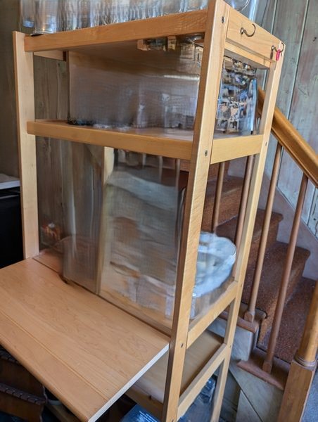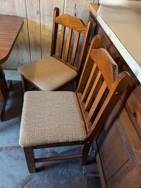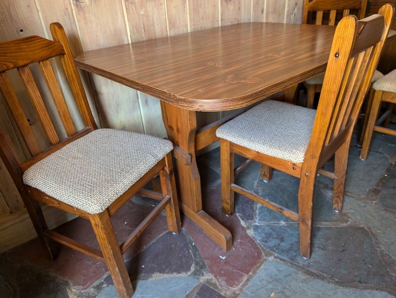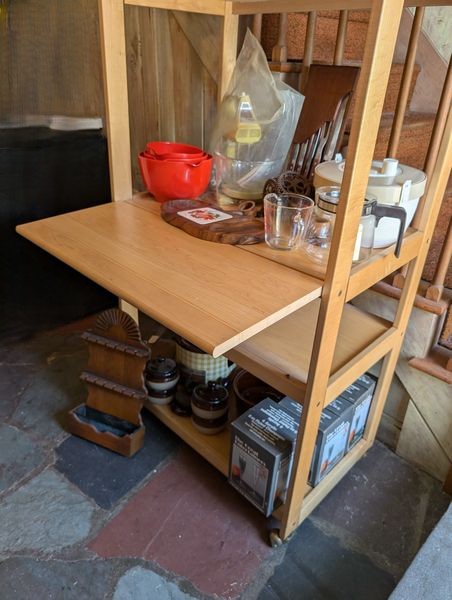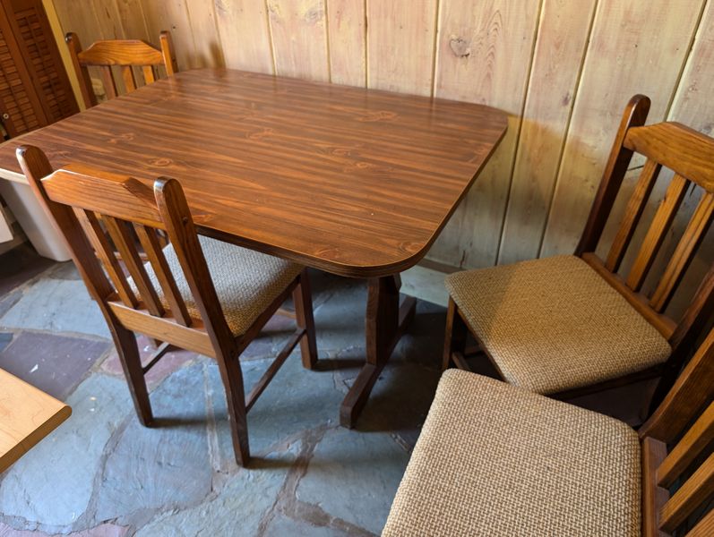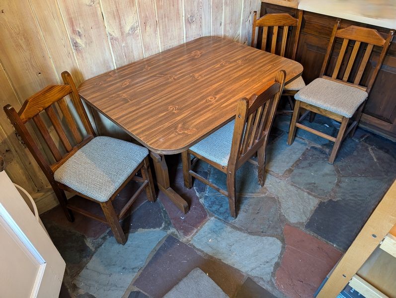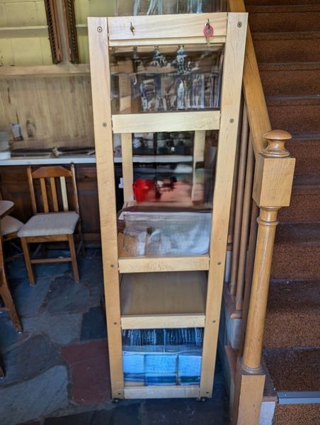 Kitchen Table, Tall Shelf. Kitchen dinette set incl table, 47"Lx35"Wx30"H & set of 4 chairs, ea. 16"Wx14.5"Dx3'H; tall open shelf with wine glass holders & drop down front. Items seen on shelves incl in lot #36.