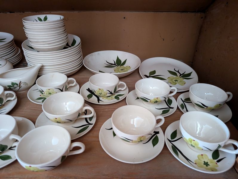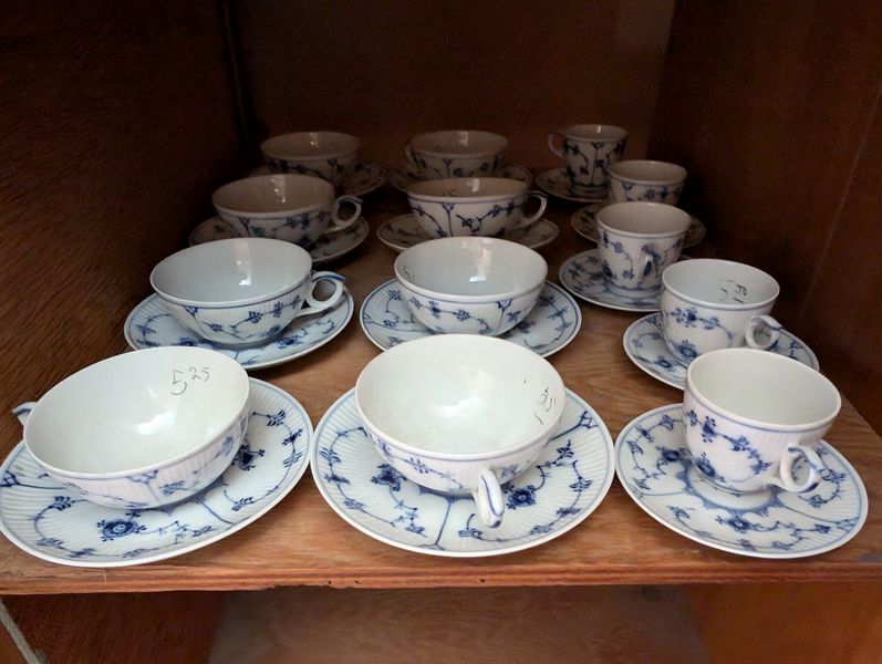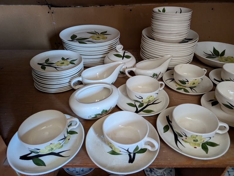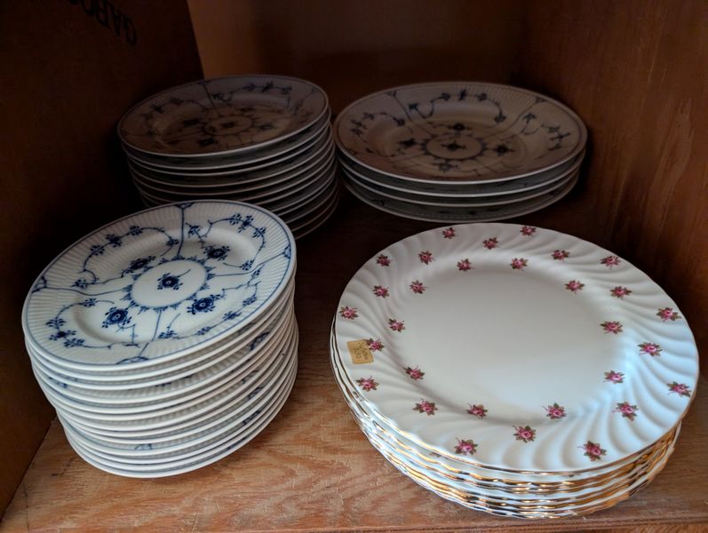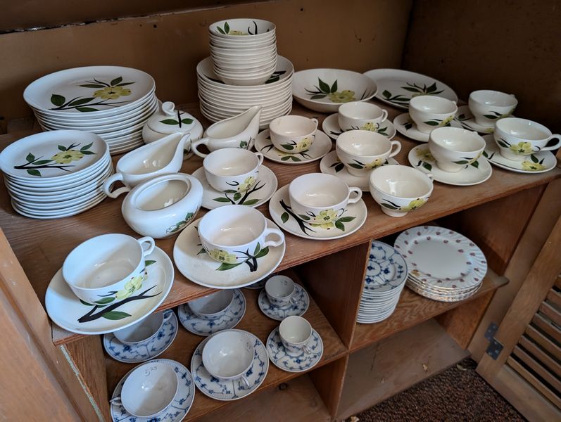 Antique Dish Sets, US and Denmark. Royal Copenhagen (incomplete) dish set; Dixie Dogwood Blue Ridge Southern, serv/12 (incomplete); Aynsley dishes (incomplete). See photos for qty & details. Loc on 2nd fl.