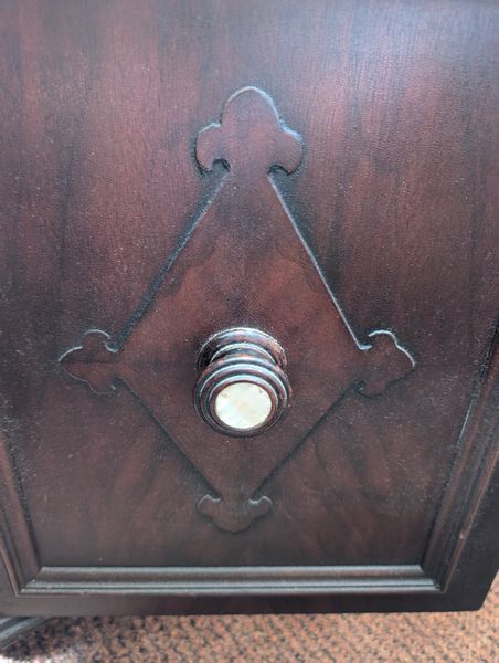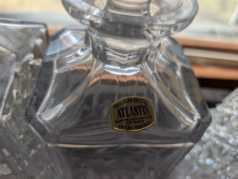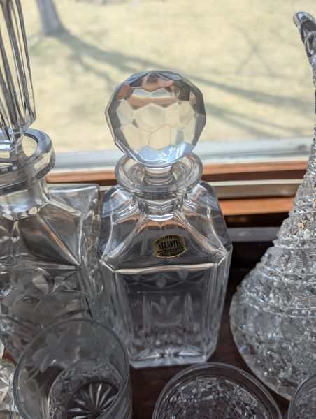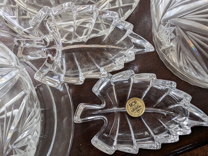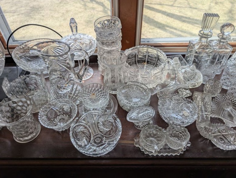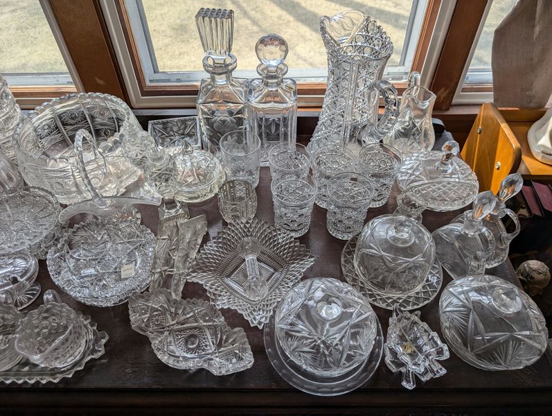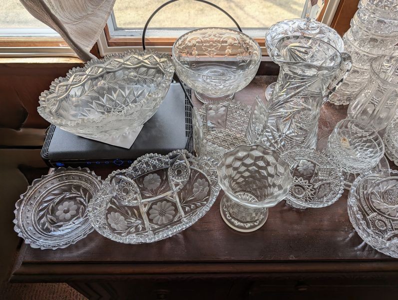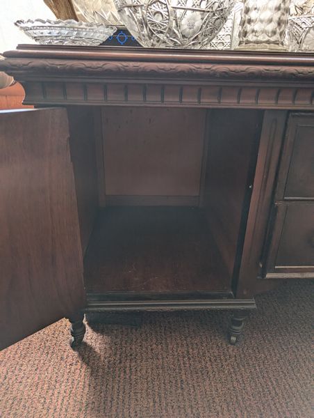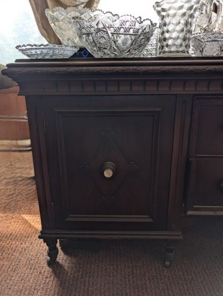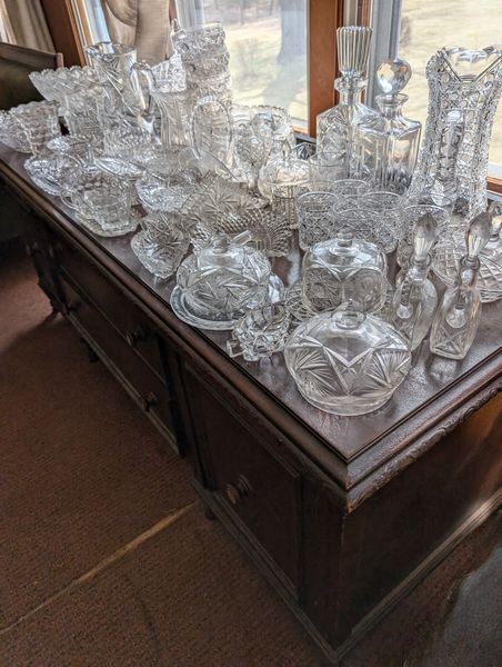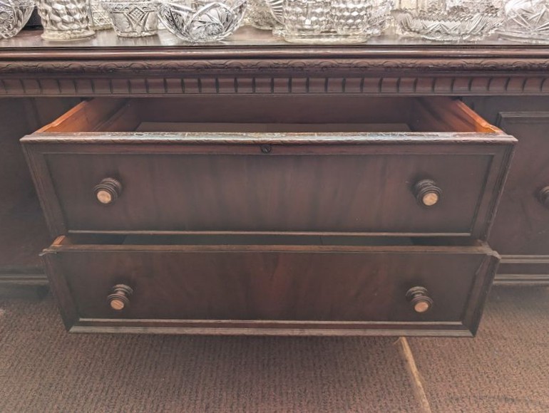Antique Sideboard Buffet, Crystal & Glass Entertaining. Hardwood sideboard buffet with cab storage, dovetailed drawers & mother-of-pearl inlaid knobs, 65"Lx23"Dx27"H; assort crystal & cut glass ent pcs (approx. 58 pcs), incl bowls; pitchers; decanters; lead crystal leaf dishes; more! Loc on 2nd floor above garage. Bring help to safely remove.