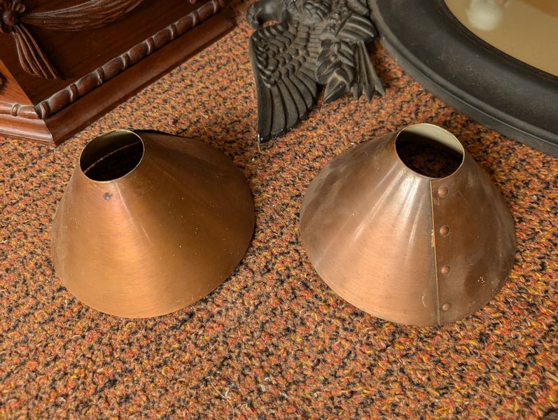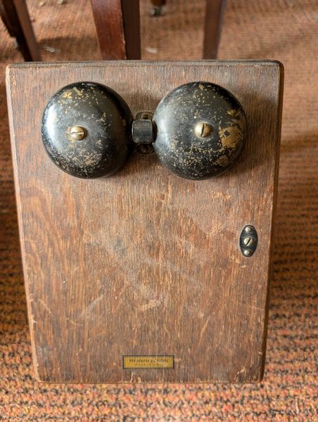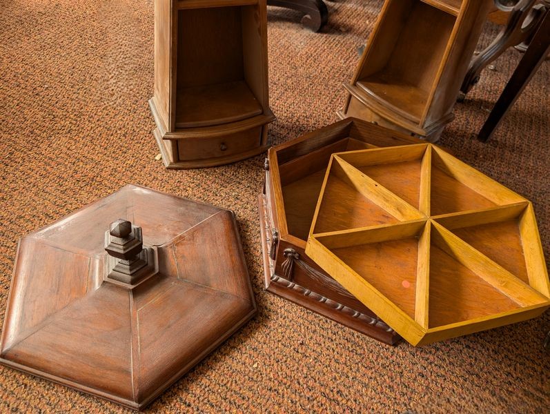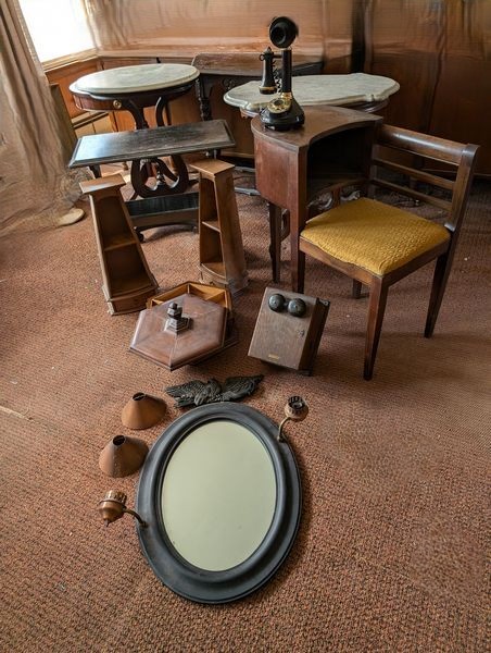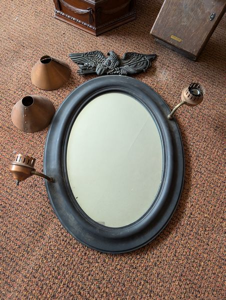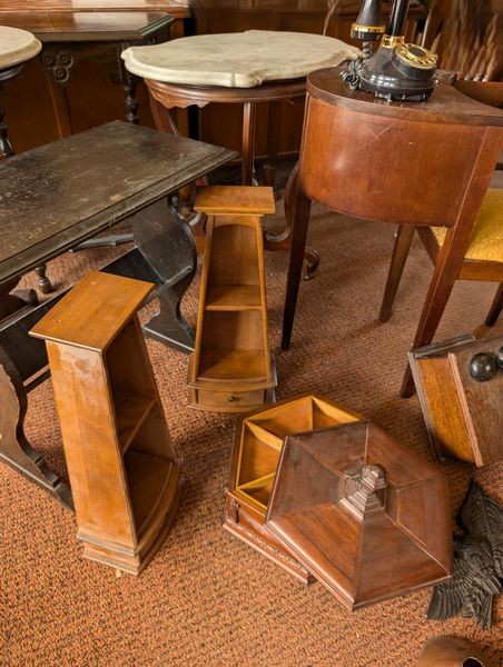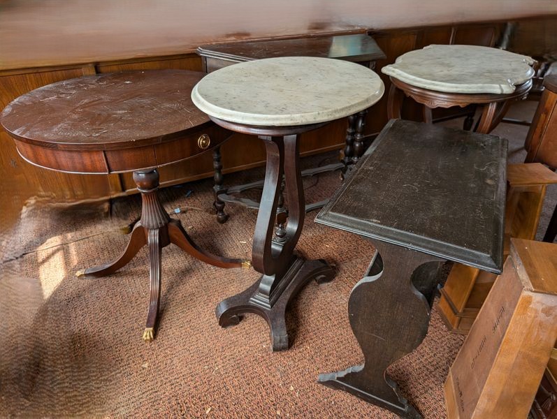 Small Furniture, featuring Telephone Table. Five tables, incl: oval marble top table, 22"Lx17"Wx31"H; clawfoot pedestal drum table, 26"diam x 27"H (surf ware); octagonal sewing box with tray & cover, 13"Wx6"H; telephone table, 28"Wx15"Dx28"H; antique mirror with sconces and copper shades, 2'Wx17.5"H; Western Electric wood wall phone cab; more! See photos. Loc on 2nd floor above garage.