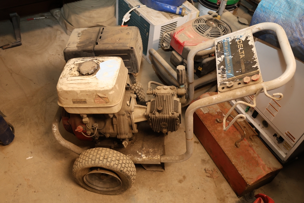 Delta industrial pressure washer model DTH3635 powered by Honda GX 11.0 engine, rated 3600 psi and 3.5 gal per minute, mounted on wheeled frame with handle. Seller reports: Ran when stored, needs TLC.