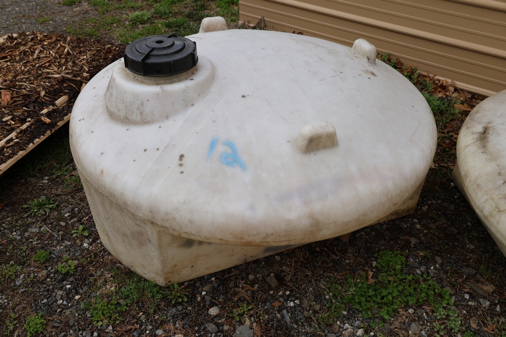 Snyder Industries plastic tank, approximately 150 gallon capacity, with screw-on lid.