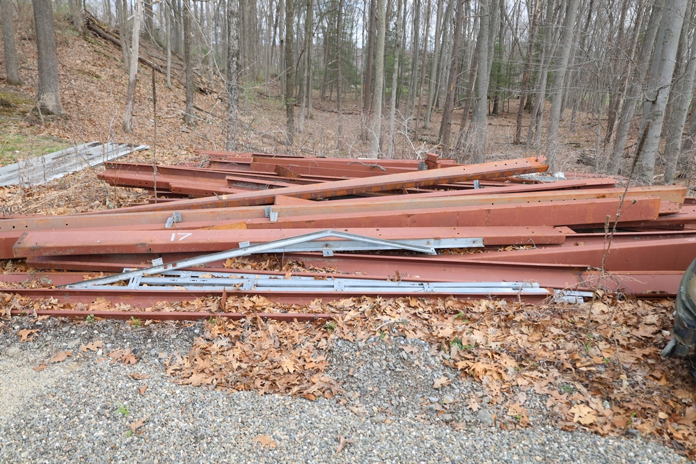Structural steel components and metal panels from 30 ft x 50 ft building, including red painted beams, posts, and framing members with pre-drilled connection holes; additional galvanized and painted metal panels and trim pieces; mixed lengths and profiles.