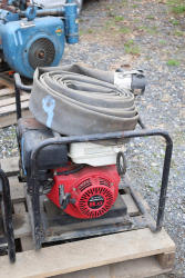 Riverside Pump model TP3H 3 inch trash pump rated 328 GPM powered by Honda GX240 8.0 engine, mounted in protective frame with two rolled hoses attached. Seller reports: In working condition.